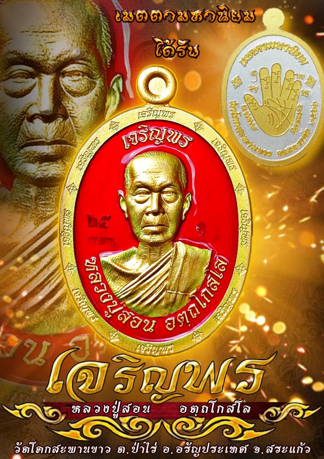 เรียกได้ว่าพลังแห่งบุญ พลังแห่งความศรัทธา จึงทำให้ญาติโยมมากันล้นวัดเลยทีเดียว สำหรับพิธีพุทธาภิเษก ปลุกเสกเหรียญเจริญพร รุ่นแรก โดย หลวงปู่สอน อัตถโกสโล วัดโคกสะพานขาว อ.อรัญประเทศ จ.สระแก้ว ซึ่งภายในพิธีมีพระเกจิคณาจารย์ร่วมนั่งปรก อธิฐานจิตมากมาย พร้อมทั้งเปิดให้ผู้ที่มีจิตศรัทธาและลูกศิษย์ลูกหาได้ร่วมเช่าบูชา อีกทั้งยันต์เรียกทรัพย์ ฝ่ามือเมตตามหานิยมเรียกทรัพย์จับเงินล้าน โดยคำที่หลวงปู่สอนท่านให้ท่องเอาไว้คือคำว่า “ได้รับ ได้รับ ได้รับ” มีความหมายว่าให้ได้รับแต่สิ่งที่ดี ๆ ตลอดเวลา ซึ่งงานนี้มีคุณโก้ ทีมงานเจริญพร คุณกิ๊ฟ คุณชัยวัฒน์ และบรรดาคณะศิษย์จัดถวาย