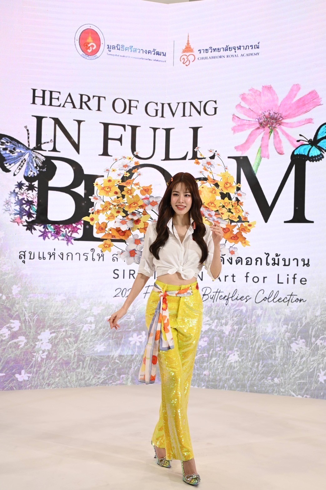 งดงามของผลิตภัณฑ์การกุศลในคอลเลกชันนี้ผ่านการแสดงแบบแฟชั่นโชว์สุดตระการตาด้วยไฮไลท์การแสดงฟินาเล่ดั่งดอกไม้บาน จากศิลปินดารา พร้อมด้วยนักศึกษาและแพทย์จากราชวิทยาลัยจุฬาภรณ์ โดยมี FULL BLOOM MODEL นำโดย เกรซ -กาญจน์เกล้า ด้วยเศียรเกล้า , ฮาน่า – ทัศนาวลัย จักรพงษ์ , หน่อย – บุษกร วงศ์พัวพันธ์ , หมอก้อง – สรวิชญ์ สุบุญ,ปีเตอร์แพน – ทัศน์พล วิวิธวรรธน์, มาริลิน เคท การ์ดเนอร์, ส้มโอ – ยลรตี โคมกลอง, มิล – ศรุต นวประดิษฐกุล , โบ๊ท – ธารา ทิพา , เจิ้น – วีระกฤษณ์ วัชรศรีวราห์ ร่วมแสดงแบบแฟชั่นโชว์การกุศลในคอลเลกชันนี้ซึ่งมีผลิตภัณฑ์หลากหลายไอเทมที่รังสรรค์จากลวดลายภาพวาดฝีพระหัตถ์ “ดอกไม้และผีเสื้อ” อันทรงคุณค่าขององค์สิริศิลปิน อาทิ เสื้อเชิ้ต เสื้อโปโล เสื้อครอป เสื้อยืด กระเป๋าในรูปทรงต่าง ๆ กระเป๋าเดินทาง หมวก ผ้าพันคอ เนคไท หมอนอิง หมอนรองคอ ร่ม ชุดถ้วยจานชามเซรามิค ชุดถ้วยกาแฟ และน้ำหอม ทั้งนี้ ผลิตภัณฑ์คอลเลกชันดังกล่าวเปิดให้ผู้มีจิตศรัทธาได้ร่วมบริจาคเพื่อมอบเป็นของขวัญชิ้นพิเศษให้กับตัวเองและคนที่คุณรักเพื่อส่งต่อความสุขในช่วงเทศกาลต้อนรับปีใหม่นี้ โดยรายได้สมทบทุนมูลนิธิศรีสวางควัฒน ในพระอุปถัมภ์ ฯ เพื่อช่วยเหลือผู้ป่วยที่ขาดแคลนด้อยโอกาส และสนับสนุนการจัดหาเครื่องมือทางการแพทย์ให้กับโรงพยาบาลจุฬาภรณ์ ราชวิทยาลัยจุฬาภรณ์