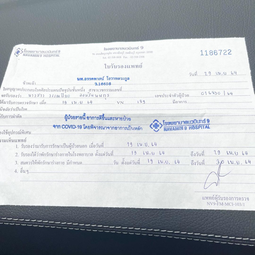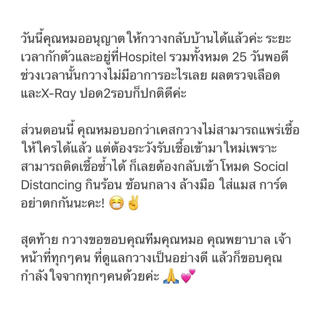 โดยสาวกวาง ได้ระบุว่า ในวันนี้แพทย์ได้อนุญาตให้กลับบ้านได้ โดยระยะกักตัวที่ Hospitel ทั้งหมด 25 วัน ซึ่งไม่มีอาการอะไรเลย และผล X-Ray ปอกทั้งสอง 2 ก็ปกติ โดยทางแพทย์ยังบอกอีกว่าในเคสของตนนั้นไม่สามารถแพร่เชื้อให้ได้ใครแล้ว แต่ต้องระวังว่าอาจจะรับเชื้อเข้ามาใหม่ได้ เพราะสามารถติดเชื้อซ้ำได้ พร้อมทั้งขอบคุณทีมแพทย์ พยาบาล และเจ้าหน้าที่ทุกคนที่ดูตนเป็นอย่างดี รวมถึงกำลังใจจากทุกๆ คนด้วย