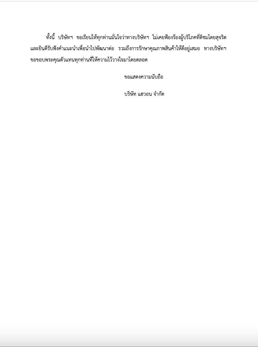 ทั้งนี้ บริษัทฯ ขอเรียนให้ทุกท่านมั่นใจว่าทางบริษัทฯ ไม่เคยฟ้องร้องผู้บริโภคที่ติชมโดยสุจริต และยินดีรับฟังคำแนะนำเพื่อนำไปพัฒนาต่อ รวมถึงการรักษาคุณภาพสินค้าให้ดีอยู่เสมอ ทางบริษัทฯ ขอขอบพระคุณตัวแทนทุกท่านที่ให้ความไว้วางใจมาโดยตลอด