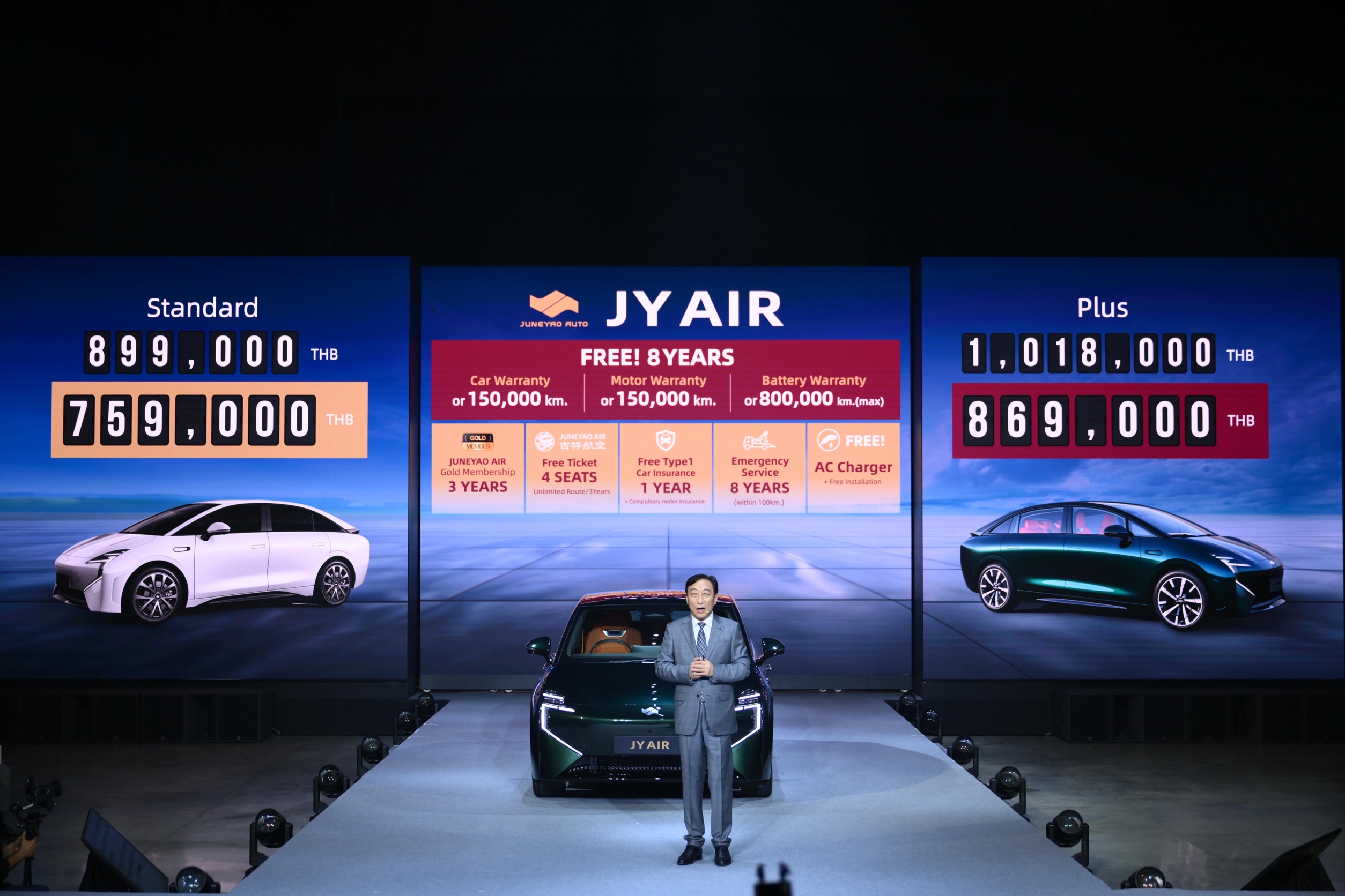 ในครั้งนี้ จูนเหยา พร้อมแล้วที่จะนำเสนอรถยนต์ไฟฟ้ารุ่นแรก JY AIR รูปแบบใหม่ของการเดินทาง พร้อมเทคโนโลยีอัจฉริยะที่จะมอบความสุขในทุกมิติ ผสมผสานระหว่างนวัตกรรมการขับขี่ที่ให้ความสะดวกสบายเหมือนที่อยู่บน First class