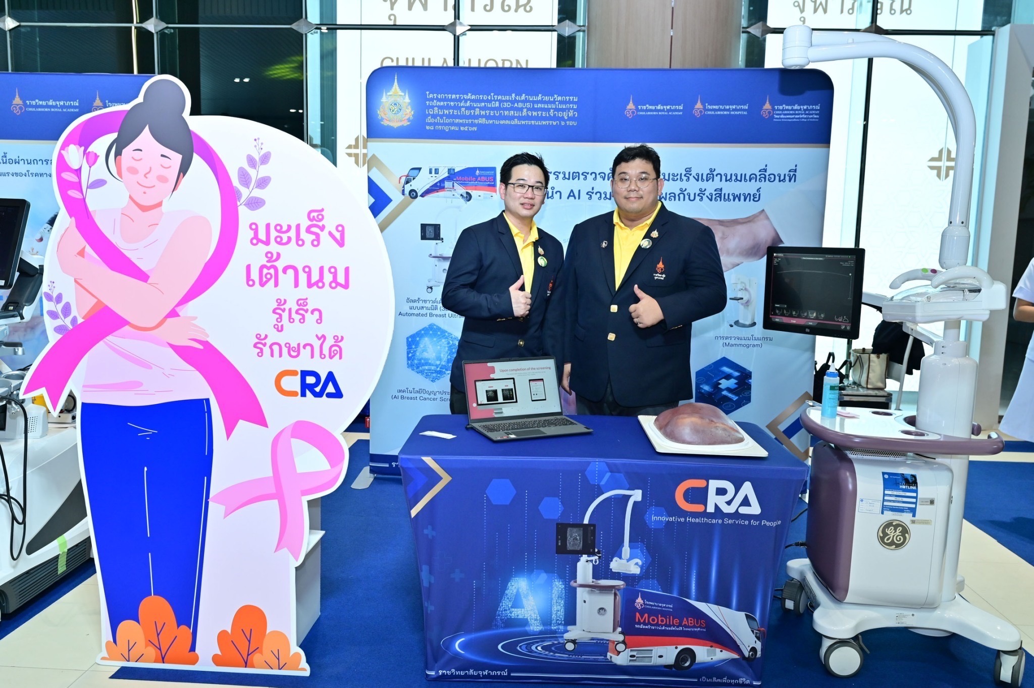 โครงการที่ ๓ โครงการตรวจคัดกรองโรคมะเร็งเต้านมด้วยนวัตกรรมรถอัลตราซาวด์เต้านมสามมิติ(3D-ABUS) และแมมโมแกรม ส่งเสริมการนำนวัตกรรมมาใช้ในการดูแลสุขภาพประชาชนด้านการป้องกันโรคมะเร็ง โดยโรงพยาบาลจุฬาภรณ์ ร่วมกับวิทยาลัยแพทยศาสตร์ศรีสวางควัฒน ได้ออกแบบระบบบริการตรวจคัดกรองมะเร็งเต้านมโดยนำนวัตกรรมรถอัลตราซาวด์เต้านมสามมิติและแมมโมแกรม พร้อมระบบ AI ร่วมวินิจฉัยกับรังสีแพทย์ ซึ่งเป็นผลงานการสร้างสรรค์นวัตกรรมสุขภาพจากบุคลากรราชวิทยาลัยจุฬาภรณ์ที่ได้รับรางวัลจากเวทีประกวดนวัตกรรมและสิ่งประดิษฐ์ระดับนานาชาติ นำมาใช้ในการออกหน่วยลงพื้นที่สู่ชุมชนเพื่อเพิ่มโอกาสในการเข้าถึงการตรวจคัดกรองมะเร็งเต้านมในสตรีกลุ่มเสี่ยงและด้อยโอกาส ในเขตพื้นที่กรุงเทพมหานครโซนเหนือ จังหวัดปทุมธานีและนนทบุรี จำนวน ๗๒๐ ราย โดยมุ่งหวังว่าจะเป็นประโยชน์ต่อการพัฒนาระบบบริการสุขภาพให้กับประเทศไทยและเพิ่มโอกาสในการเข้าถึงการตรวจคัดกรองมะเร็งเต้านมในพื้นที่ห่างไกลต่อไป