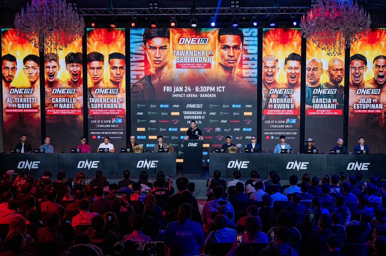 วัน แชมเปียนชิพ (ONE) องค์กรศิลปะการต่อสู้ที่ยิ่งใหญ่ที่สุดในโลก แถลงข่าวจัดการแข่งขันศึก ONE 170 โดยมีทัพนักนักกีฬาและสื่อมวลชนหลายร้อยสำนัก รวมถึงแฟน ๆ เข้าร่วมงานมากมาย