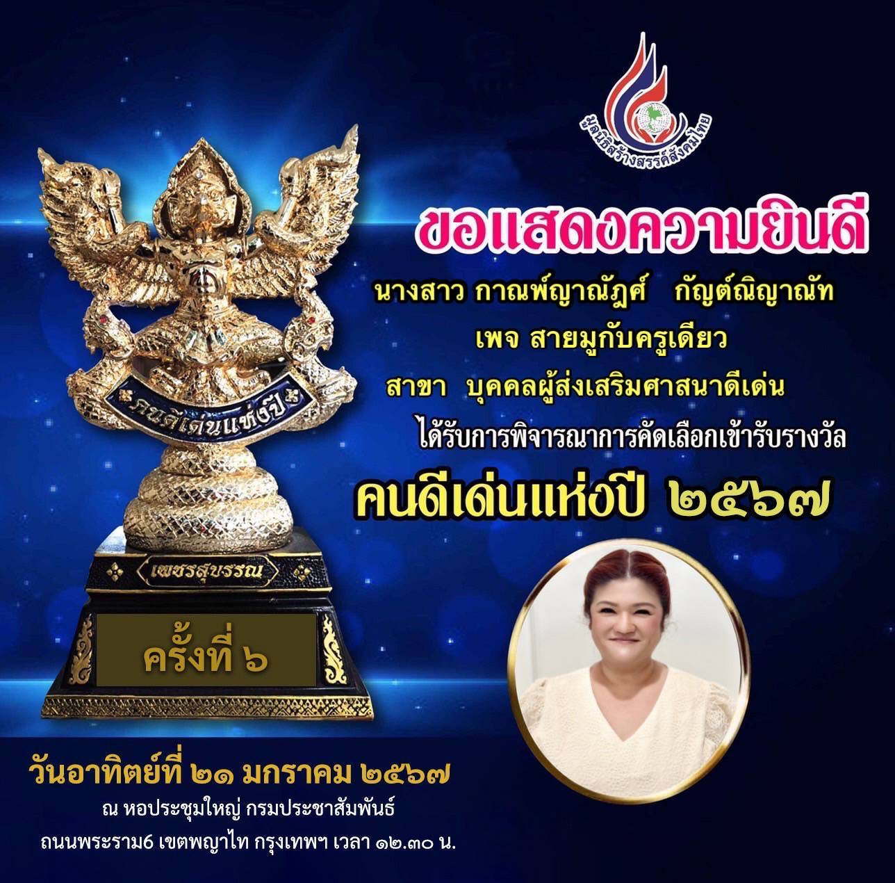 โดยมี คุณกาณพ์ญาณัฎศ์ กัญต์ณิญาณัท หมอดูชื่อดัง เจ้าของเพจ “สายมูกับครูเดียว” นำทัพเข้ารับ 2 รางวัลใหญ่ คือ รางวัล เพชรสุบรรณ คนดีเด่นแห่งปี 2567 ในสาขา บุคคลผู้ส่งเสริมศาสนาดีเด่น และ รางวัล ศรีสุวรรณ บุคคลตัวอย่างดีเด่น ประจำปีพุทธศักราช 2567 ในสาขา ผู้ทำคุณประโยชน์ต่อสังคมดีเด่น