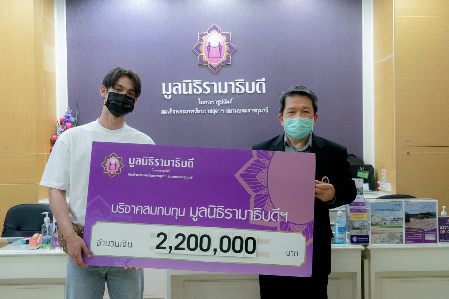 ผศ.นพ.ธงชัย พงศ์มฆพัฒน์ กรรมการบริหารและเหรัญญิกมูลนิธิรามาธิบดีฯ ตัวแทนรับมอบเงินบริจาค โครงการป้องกันและช่วยเหลือสถานการณ์แพร่ระบาดโควิด-19 มูลนิธิรามาธิบดี คณะแพทยศาสตร์ มหาวิทยาลัยมหิดล เพื่อจัดซื้อเครื่องช่วยหายใจควบคุมด้วยปริมาตรและความดันเคลื่อนย้ายได้ (BIPAP) ยี่ห้อ Philips Respironics รุ่น Trilogy EVO จำนวน 2เครื่อง จำนวน 1,200,000 บาท และ โครงการสร้างห้องไอซียูความดันลบ เพื่อสถาบันการแพทย์จักรีนฤบดินทร์ คณะแพทยศาสตร์โรงพยาบาลรามาธิบดี จำนวน 1,000,000 บาท.
