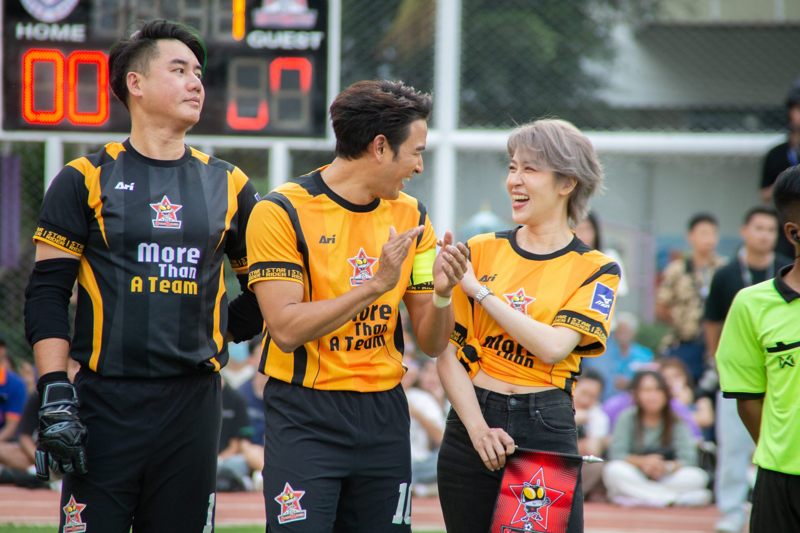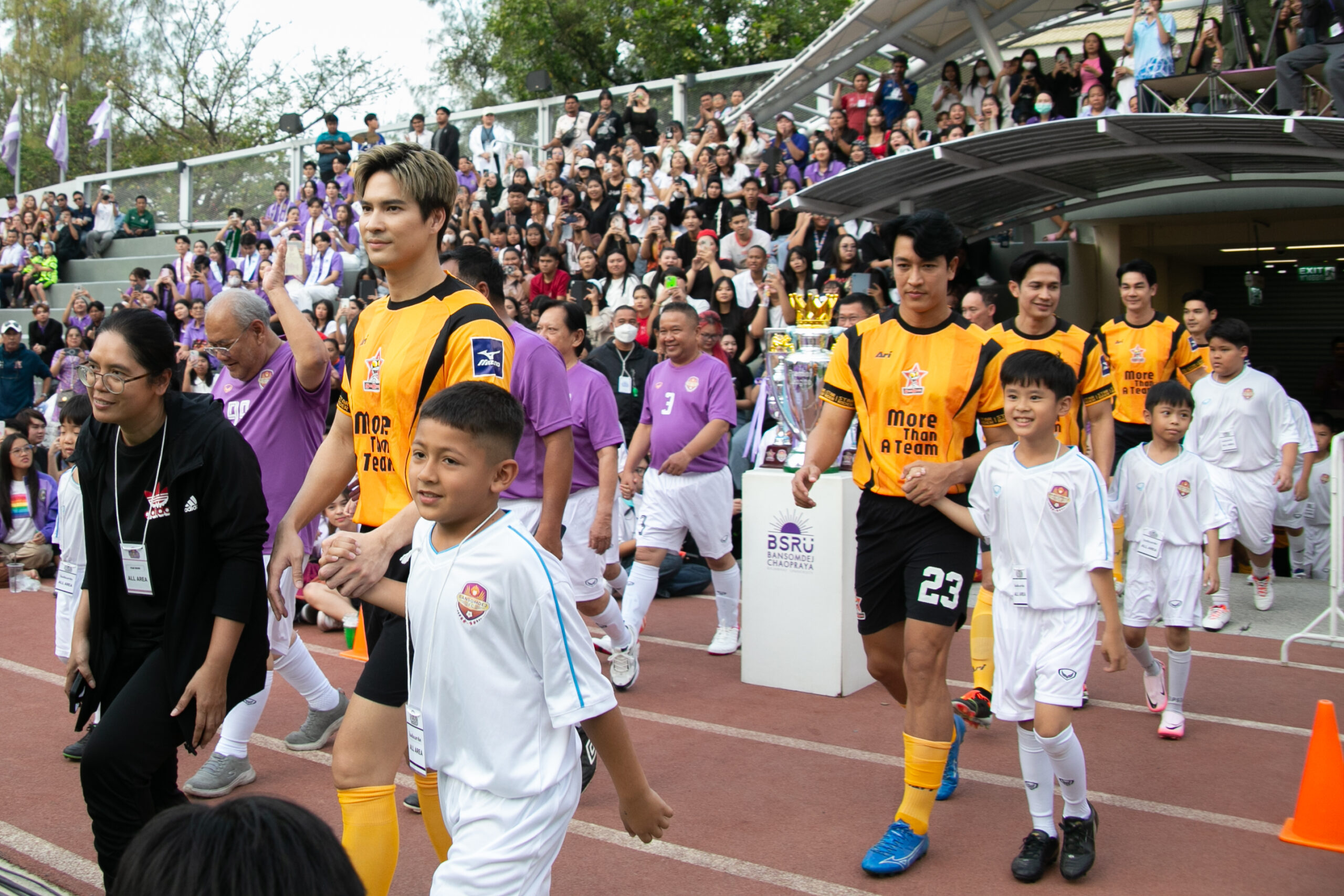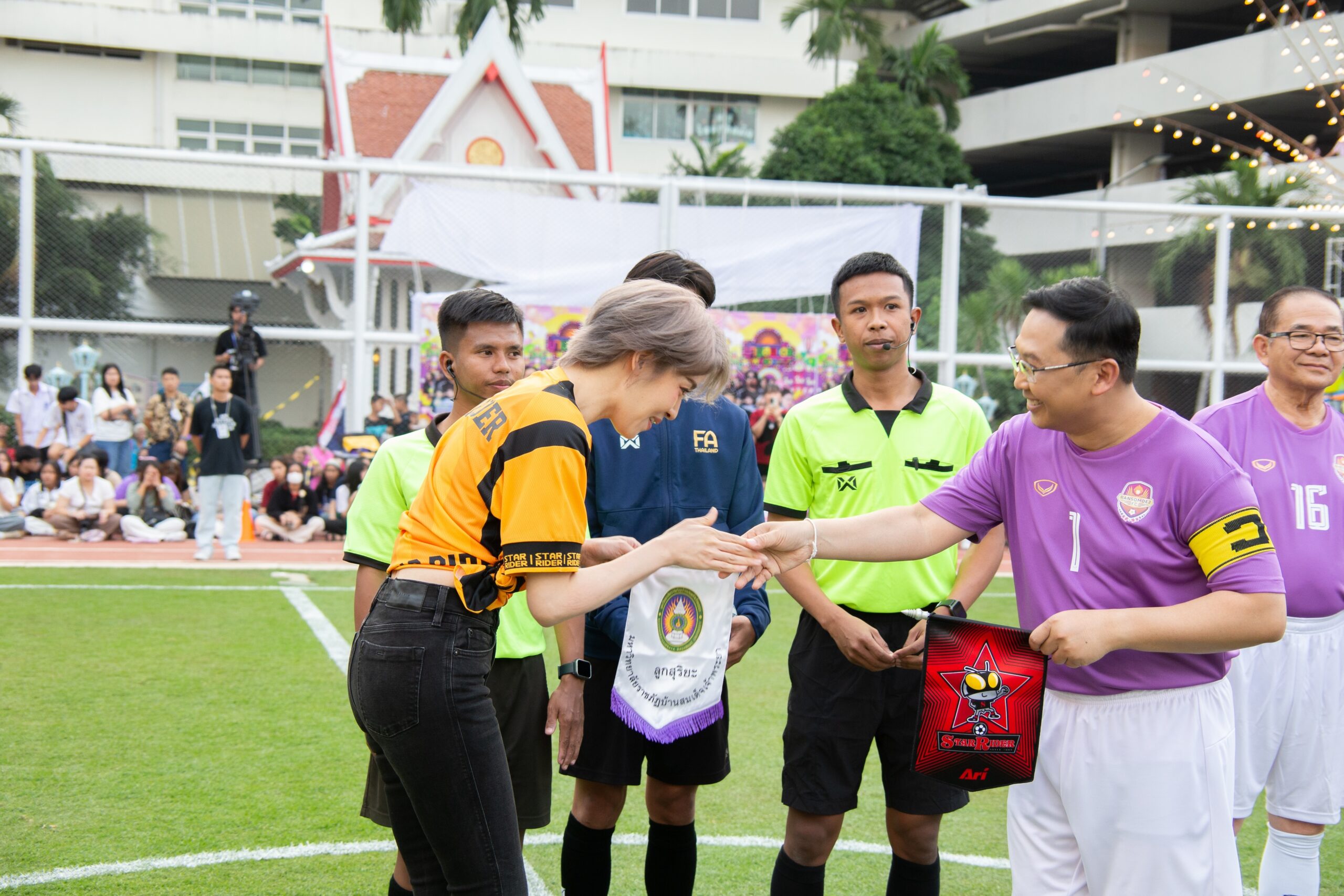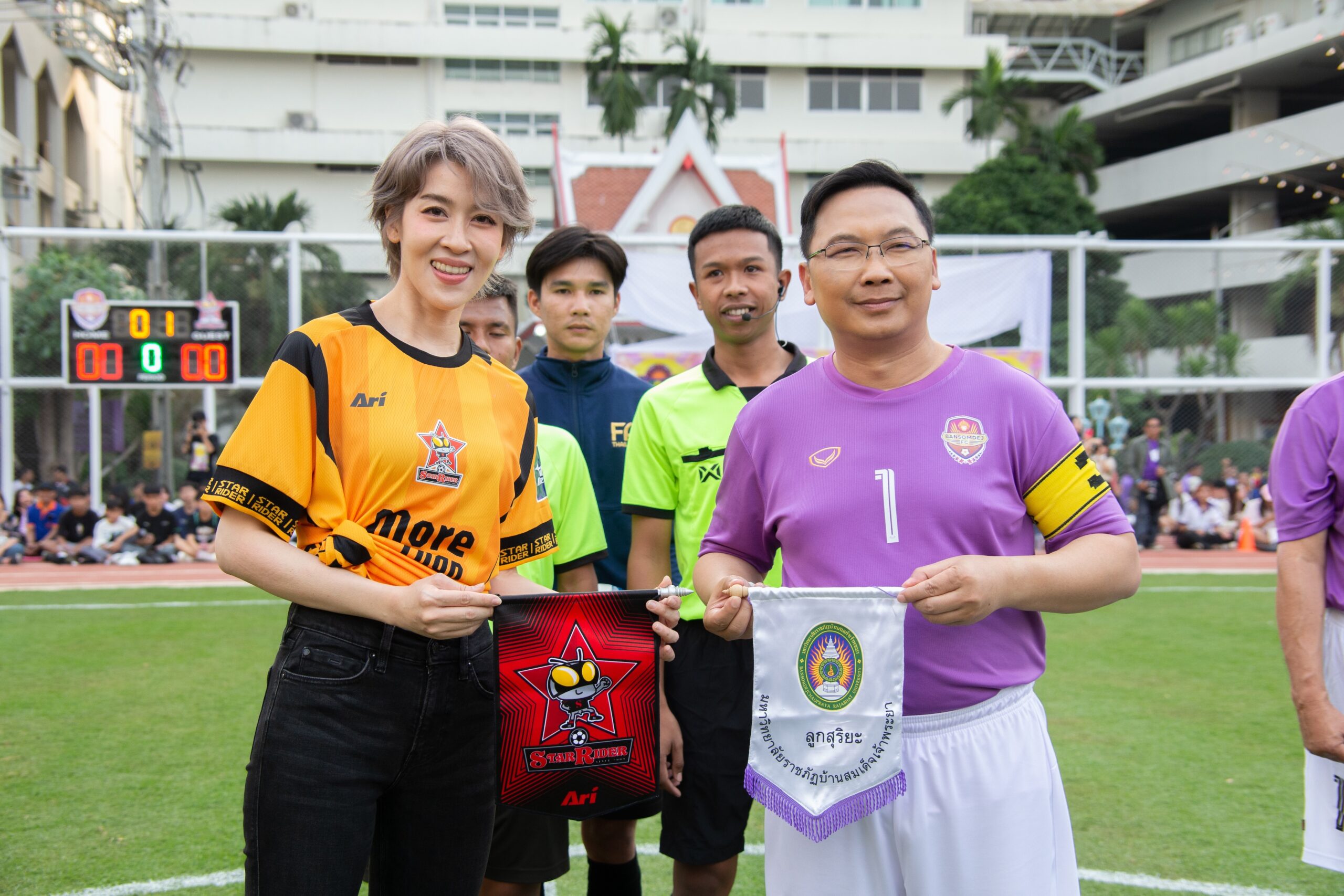 งานนี้คนหล่อใจกุศลมากันแน่น แถมยังมีสาวเท่อย่าง เชียร์ ฑิฆัมพร ฤทธิ์ธาอภินันท์ เดินนำนักเตะลงสู่สนามท่ามกลางเสียงเชียร์กระหึ่ม สนามฟุตบอลมหาวิทยาลัยราชภัฏบ้านสมเด็จเจ้าพระยา คึกคักไปด้วยผู้ชมที่รายล้อม อุปกรณ์การเชียร์ครบมือ ผศ.ดร.คณกร สว่างเจริญ อธิการบดีมหาวิทยาลัยราชภัฏบ้านสมเด็จเจ้าพระยา กล่าวเปิดงาน และนำนักเตะทีม BANSOMDEJ FC ลงเตรียมดวลแข้ง แลกธง วอร์มร่างกาย จากนั้น ผศ.ดร.ณัฏฐ์ เดชะปัญญา รองอธิการบดี นำทีม BANSOMDEJ FC ถ่ายภาพกระชับมิตรร่วมกับทีม STAR RIDER FC ก่อนจะเปิดเกมส์รุก-รับกันสุดมันส์ ซึ่งผลการแข่งขัน ปรากฏว่าคนหล่อทีมเยือน STAR RIDER FC เอาชนะทีม BANSOMDEJ FC ไปด้วยสกอร์ 9:4 จากแข้งของ เกรท วรินทร , ไมค์ ภัทรเดช ,กิก ดนัย ,กอล์ฟ อนุวัฒน์, คิง ก่อนบ่ายฯ งานนี้ทุกคนใจฟู เพราะนอกจากได้กระชับสัมพันธ์อันดีแล้ว รายได้จากการจัดงานทั้งหมดนำไปเป็นทุนการศึกษา และ บูรณะศาลสมเด็จเจ้าพระยาบรมมหาศรีสุริยวงศ์ (ช่วง บุนนาค) ตามเจตนารมณ์ของมหาวิทยาลัยราชภัฏบ้านสมเด็จเจ้าพระยาอีกด้วย.