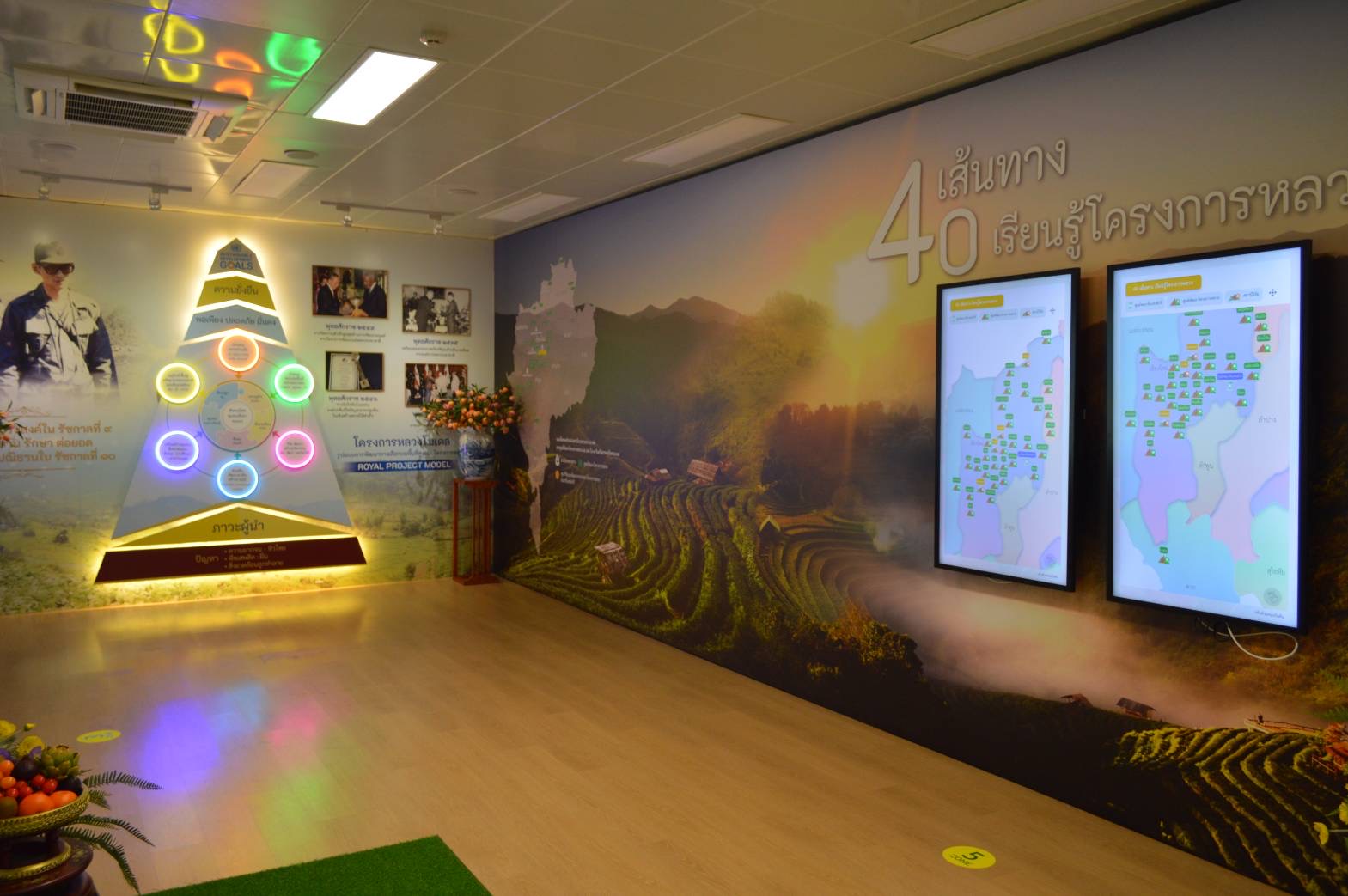 ภายในสถาบันฯ แบ่งออกเป็น 2 ชั้นหลัก ชั้นแรกเป็นโซนจำหน่ายผลิตภัณฑ์คุณภาพจากโครงการหลวงหลากหลายผลิตภัณฑ์ ส่วนชั้นที่ 2 เป็นพื้นที่จัดแสดงนิทรรศการทั้งประวัติความเป็นมาของมูลนิธิโครงการหลวง โครงการภายใต้การดำเนินงานของมูลนิธิฯ ตลอดจนอัจฉริยภาพของพระบาทสมเด็จพระชนกาธิเบศร มหาภูมิพลอดุลยเดชมหาราช บรมนาถบพิตร ในการขจัดปัญหาการปลูกฝิ่นบนพื้นที่สูง โดยการสนับสนุนการปลูกพืชเศรษฐกิจทดแทน พร้อมทั้งพัฒนาคุณภาพชีวิตของราษฎรบนภูเขาไปพร้อมกัน