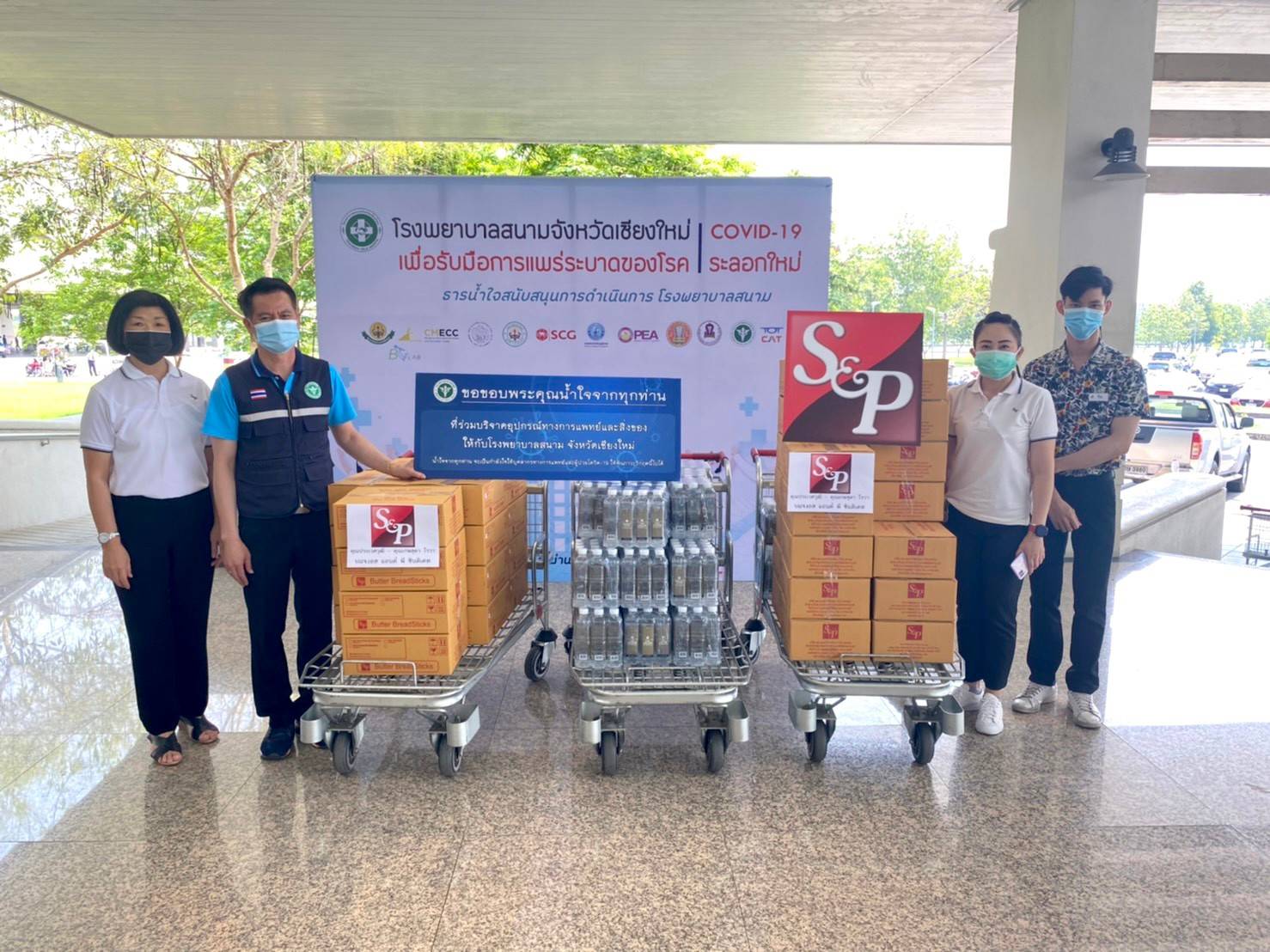 เอส แอนด์ พี ได้ส่งมอบผลิตภัณฑ์ให้แก่โรงพยาบาลและโรงพยาบาลสนามในภูมิภาคต่างๆ รวม 35 แห่ง ได้แก่ โรงพยาบาลพระมงกุฎเกล้า, โรงพยาบาลราชวิถี, โรงพยาบาลศิริราช, สถาบันบำราศนราดูร, โรงพยาบาลวชิรพยาบาล, โรงพยาบาลรามาธิบดี, โรงพยาบาลรามาธิบดีจักรีนฤบดินทร์, โรงพยาบาลจุฬาลงกรณ์, โรงพยาบาลเวชการุณย์รัศมิ์ (สังกัดกทม.), โรงพยาบาลสนามเอราวัณ2 (ศูนย์กีฬาบางกอกอารีนา), โรงพยาบาลภูมิพลอดุลยเดช, โรงพยาบาลสนามกองทัพอากาศ (ทอ.), โรงพยาบาลทหารอากาศ (สีกัน) กรมการแพทย์ทหารอากาศ, โรงพยาบาลสมเด็จพระปิ่นเกล้า กรมแพทย์ทหารเรือ, โรงพยาบาลสนามธรรมศาสตร์ และฮอสพิเทลสถาบันมะเร็งแห่งชาติ รวมทั้งยังมีโรงพยาบาลต่างจังหวัดในภูมิภาคต่างๆ ได้แก่ ศูนย์การแพทย์สมเด็จพระเทพรัตนราชสุดาฯ สยามบรมราชกุมารี, โรงพยาบาลสนาม มศว.องครักษ์, โรงพยาบาลราชธานี, โรงพยาบาลราชธานี โรจนะ, โรงพยาบาลนครปฐม, โรงพยาบาลสนามนครปฐม, โรงพยาบาลราชบุรี, โรงพยาบาลสนามราชบุรี, โรงพยาบาลดำเนินสะดวก, โรงพยาบาลบ้านโป่ง, โรงพยาบาลโพธาราม, โรงพยาบาลมหาราชนครราชสีมา, โรงพยาบาลสนามนครราชสีมา, โรงพยาบาลกำแพงเพชร, โรงพยาบาลสนามกำแพงเพชร, โรงพยาบาลสนามเชียงใหม่, โรงพยาบาลมหาราชนครศรีธรรมราช และโรงพยาบาลพระพรหม (โรงพยาบาลสนาม) นอกจากนี้ เอส แอนด์ พี ได้ร่วมกับหลักสูตรประกาศนียบัตรธรรมาภิบาลทางการแพทย์สำหรับผู้บริหารระดับสูง รุ่นที่ 9 (ปธพ.9) ส่งมอบผลิตภัณฑ์ข้อไก่เนยสดสำหรับบรรจุลงถุงกำลังใจ จำนวน 10,000 ถุง เพื่อนำไปมอบให้ผู้ป่วยโควิด-19 ในโรงพยาบาลสนามทั่วประเทศอีกด้วย”