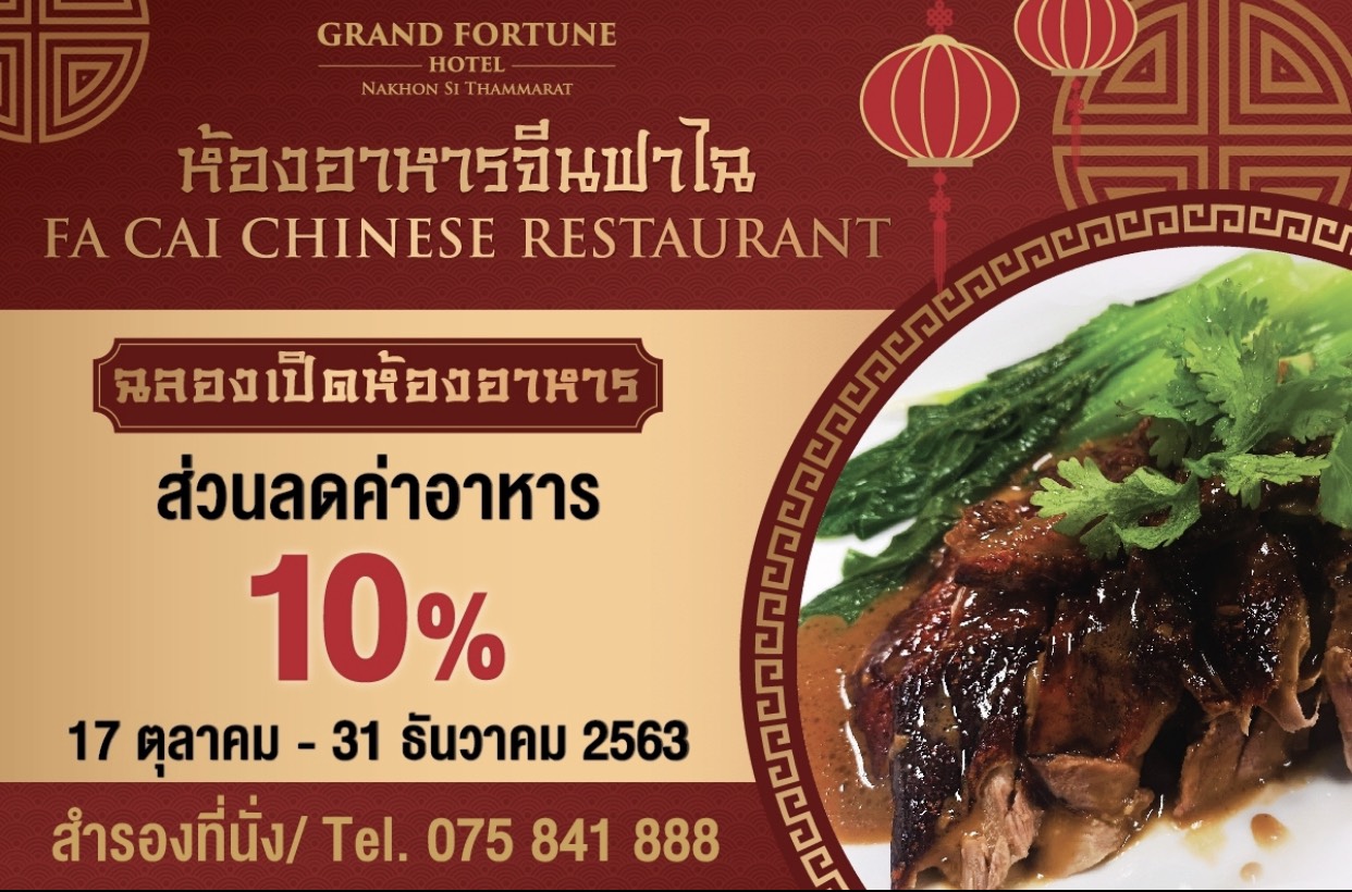 เอาใจคนรักติ่มซำ มานครศรี ต้องมาทาน โปรโมชั่นบุฟเฟ่ต์ ห้องอาหารจีนฟาไฉโรงแรมแกรนด์ ฟอร์จูน นครศรีธรรมราช ชวนคุณมาอร่อย กับบุฟเฟ่ต์แบบไม่อั้น เมนูมื้อกลางวันในราคาเบาๆ เพียงท่านละ 399 บาท หรือส่วนลดค่าอาหาร 10% สำหรับคนชอบอาหารจีน