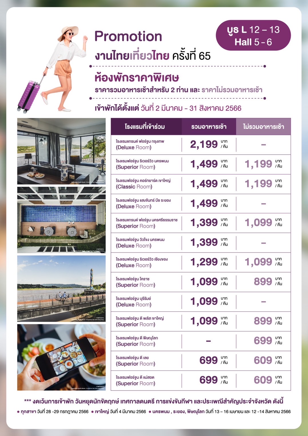 กลับมาอีกครั้งกับงานไทยเที่ยวไทย ครั้งที่ 65 โรงแรมในเครือฟอร์จูน ชวนคุณ ร่วมงานไทยเที่ยวไทย วันที่ 2 – 5 มีนาคม 2566 พบกับโปรโมชั่น ซื้อ Voucher ห้องพักราคาพิเศษ โรงแรมในเครือ ฟอร์จูน กรุ๊ป ทั้ง 13 สาขา ที่