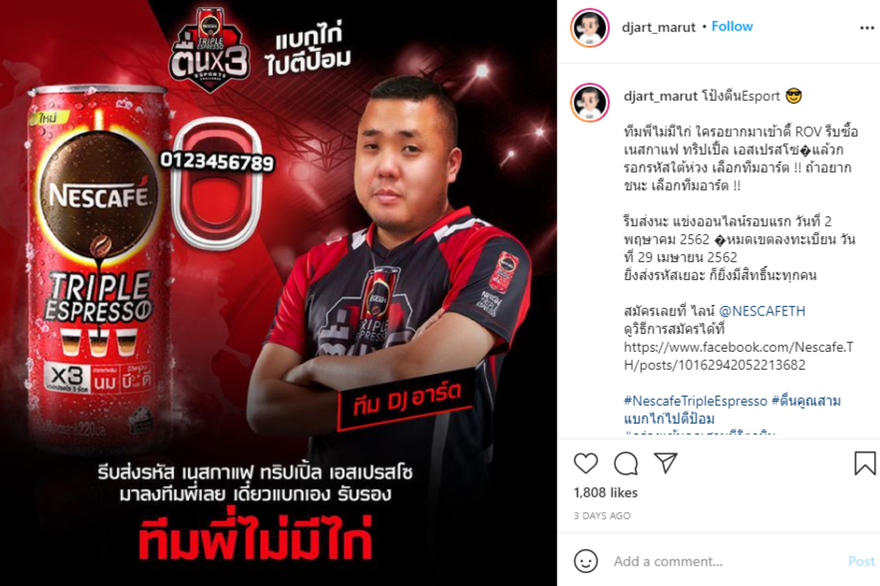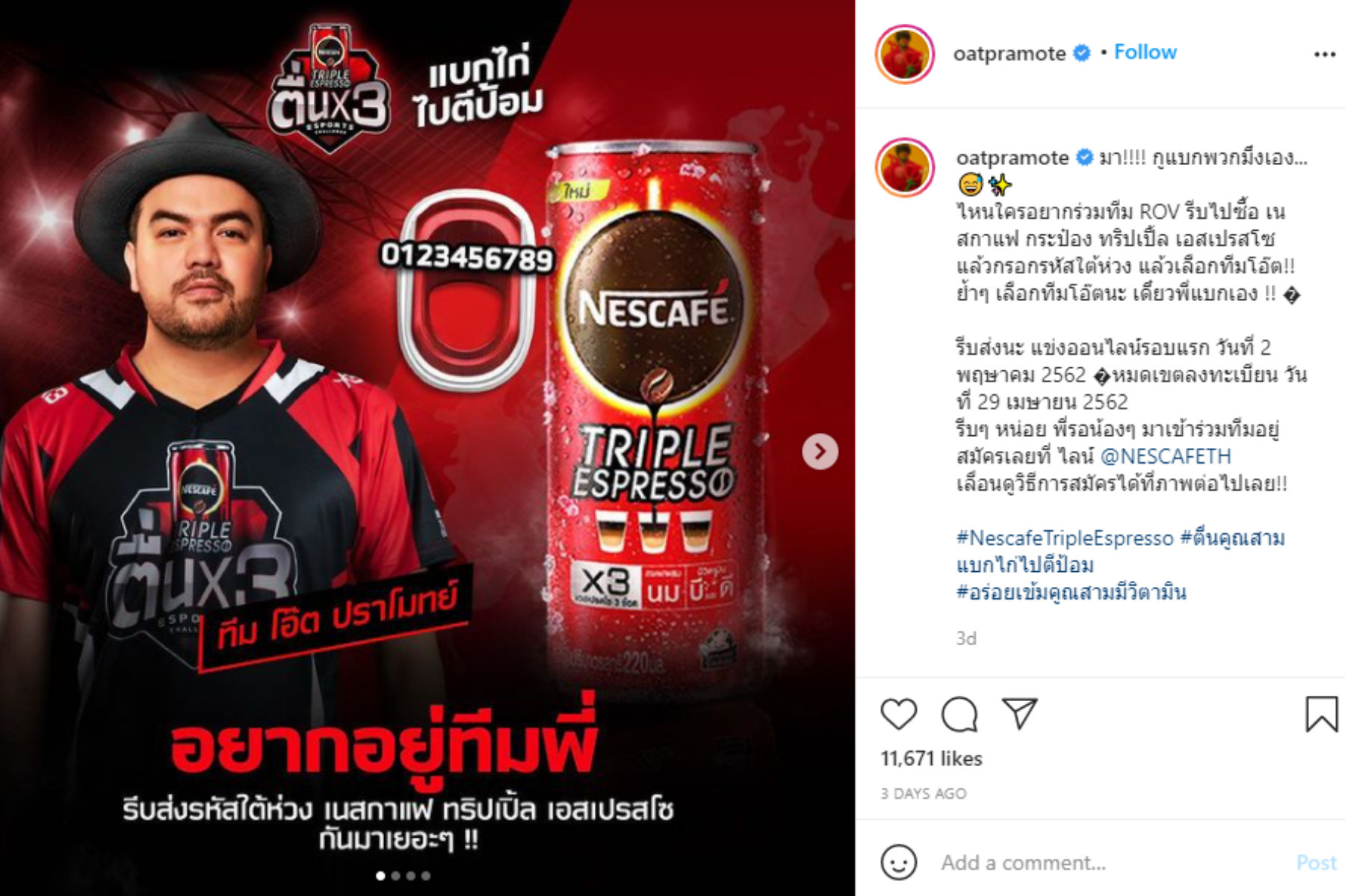 งานนี้ขิงกันสุดๆ เมื่อ โอ๊ต ปราโมทย์ ยันตัวเองไม่ใช่ไก่ พร้อมท้าดวลเพื่อน ๆ คอเกมเมอร์อย่าง ดีเจเผือก ดีเจอาร์ต และ แจ๊ส ชวนชื่น มาประชันลีลาแบกไก่ในการแข่งขัน “เนสกาแฟ ทริปเปิ้ล เอสเปรสโซ ตื่นคูณสาม อีสปอร์ต ชาเลนจ์ แบกไก่ไปตีป้อม” ครั้งแรกที่เหล่าคนดัง และโปรเพลเยอร์ชื่อดังรับอาสาเป็นหัวหน้าทีมและเปิดโอกาสให้แฟน ๆ หรือผู้เล่นมือใหม่มาสมัครร่วมทีมเป็นไก่ รวม 10 ทีม เพื่อประชันฝีมือในเกม ROV ผ่านทางออนไลน์ที่บ้านไปยาว ๆ 3 สัปดาห์ ชิงรางวัลรวมมูลค่ากว่า 500,000 บาท งานนี้ทั้งมันส์ทั้งอึด!
