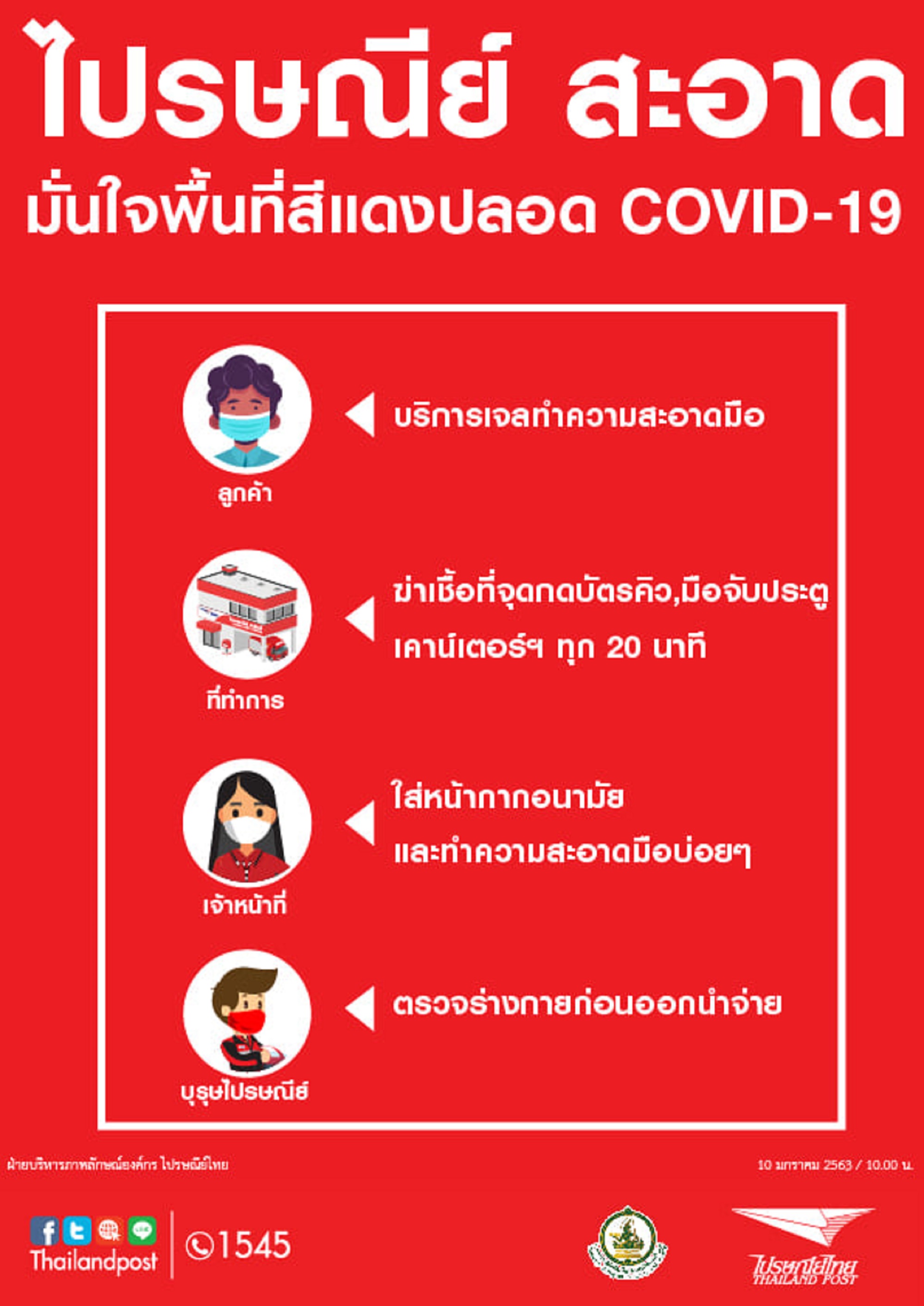 - ที่ทำการไปรษณีย์ทุกแห่งต้องคัดกรองผู้ใช้บริการก่อนเข้าที่ทำการอย่างเคร่งครัด ทั้งการตรวจวัดอุณหภูมิ การขอความร่วมมือผู้ใช้บริการสวมใส่หน้ากากอนามัย และสแกนแอปพลิเคชันก่อนเข้าใช้บริการ ให้บริการเจลล้างมือแอลกอฮอล์ตั้งแต่เข้าที่ทำการ ระหว่างใช้บริการ และหลังจากเสร็จสิ้นกิจกรรม