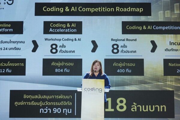 “Coding Thailand 2025: AI-Driven Future ได้รับการตอบรับอย่างดีเยี่ยมจากสถานศึกษาทั่วประเทศ ครูและนักเรียนสมัครเข้าร่วมโครงการมากถึง 3,112 ทีม หรือ 12,448 คน โดยทุกคนได้เรียนรู้ทักษะ Coding และ AI ผ่านแพลตฟอร์มออนไลน์ที่โครงการได้พัฒนาหลักสูตรขึ้น 7 หลักสูตร รวม 24 บทเรียน ก่อนจะมีผู้ที่ผ่านการคัดเลือก จำนวน 804 ทีมเข้าร่วมเวิร์คช็อปกับกิจกรรม Coding & AI Acceleration ใน 8 ภูมิภาคทั่วประเทศ ก่อนให้ครู นักเรียนนำทักษะความรู้มาประยุกต์ใช้ในการพัฒนาแนวคิดนวัตกรรม (Innovation Concept) ในธีม Smart Economy & Smart Society รวมถึงแผนพัฒนาศูนย์การเรียนรู้อย่างยั่งยืนของครูประจำทีม เพื่อคัดเลือก 400 ทีมเข้าสู่เวทีการแข่งขันระดับภูมิภาค Regional Coding & AI Competition ที่เปิดพื้นที่ให้ทุกทีมได้แสดงผลงานนวัตกรรรมต่อคณะกรรมการ และคัดเหลือ 200 ทีมเข้าสู่การแข่งขันรอบชิงชนะเลิศระดับประเทศใน National Coding & AI Competition (ทีมระดับประถมศึกษา 50 ทีม | มัธยมศึกษา 100 ทีม | อาชีวศึกษา 50 ทีม) ซึ่งจะมี 91 สุดยอดผลงานนวัตกรรมที่จะได้รับรางวัลเป็นทุนการศึกษา และทุนส่งเสริมการพัฒนาศูนย์การเรียนรู้ รวมมูลค่ากว่า 18 ล้านบาท และจะมีเพียง 1 ทีมที่ได้รับรางวัล Best of the Best พร้อมรับสิทธิ์เข้าร่วมแข่งขันในเวทีนานาชาติ Taiwan Science Festival and MARC Open Championship 2025” รักษาการรองผู้อำนวยการใหญ่ ดีป้า กล่าว