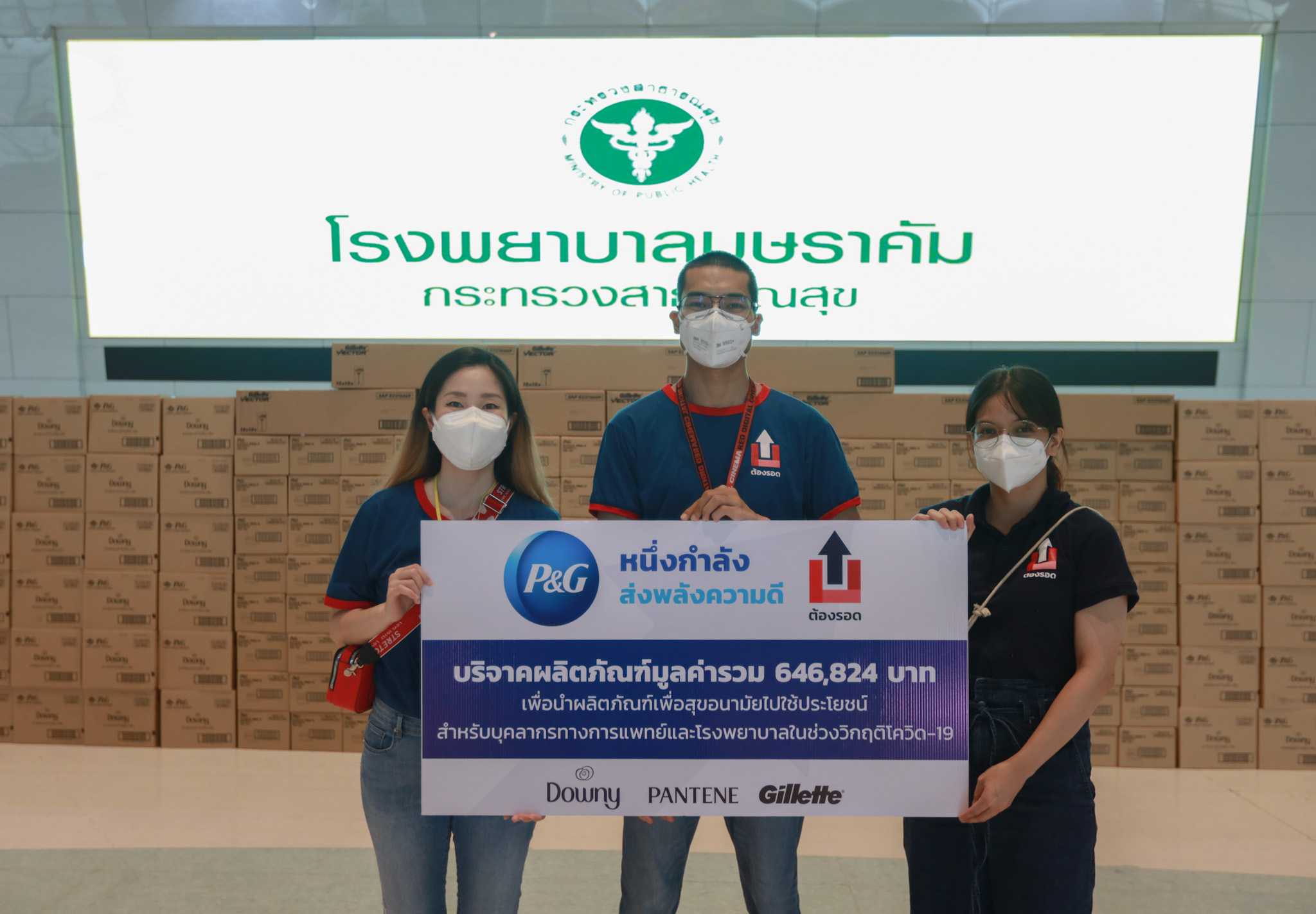 P&G ประเทศไทยสนับสนุนโครงการ “ต้องรอด” โดยกลุ่ม Up for Thai ในโครงการเฉพาะกิจ #missionบุษราคัม75 ด้วยการร่วมบริจาคผลิตภัณฑ์เพื่อสุขอนามัยจากแบรนด์ P&G มูลค่า 646,824 บาท เพื่อสนับสนุนบุคลากรการแพทย์และผู้ป่วย ณ โรงพยาบาลสนามบุษราคัม