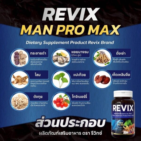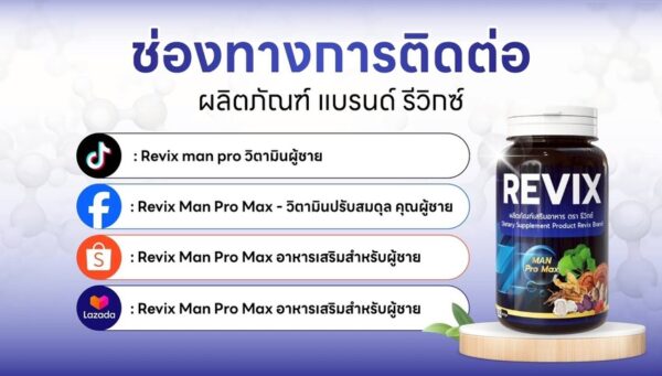 และสำหรับผู้ที่สนใจ สามารถสั่งซื้อผลิตภัณฑ์ หรือสอบถามข้อมูลเพิ่มเติมได้ที่ www.facebook.com/Revix Man Pro Max – วิตามินปรับสมดุล คุณผู้ชาย, Tiktok : Revix man pro วิตามินผู้ชาย, Shopee / Lazada : Revix Man Pro Max อาหารเสริมสำหรับผู้ชาย
