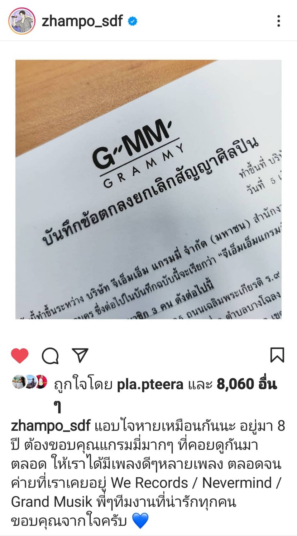 ก่อนหน้านี้มีคนตาดีแอบเห็น “แชมป์-นิตินันท์ จันทร์เดชา” นักร้องนำวง S.D.F โพสต์ใน IG บันทึกข้อตกลงยกเลิกสัญญาศิลปิน บริษัท จีเอ็มเอ็ม แกรมมี่ จำกัด (มหาชน) ในวันที่ 5 มีนาคม 2564 ที่ผ่านมา แฟนเพลงหลายคนต่างเข้ามาสอบถามว่าหมดสัญญาแล้วจะไปอยู่กับค่ายไหน ซึ่งแชมป์ S.D.F. ก็ไม่ได้เข้ามาตอบอะไร นอกจากโพสต์ขอบคุณว่า “แอบใจหายเหมือนกันนะ อยู่มา 8 ปี ต้องขอบคุณแกรมมี่มากๆ ที่คอยดูกันมาตลอด ให้เราได้มีเพลงดีๆ หลายเพลง ตลอดจนค่ายที่เราเคยอยู่ WE Records/Nevermind/Grand Musik พี่ๆ ทีมงานที่น่ารักทุกคน ขอบคุณจากใจครับ หลังจากนี้จะเป็นก้าวใหม่ของ @sdf_band รอติดตามกันนะครับ”