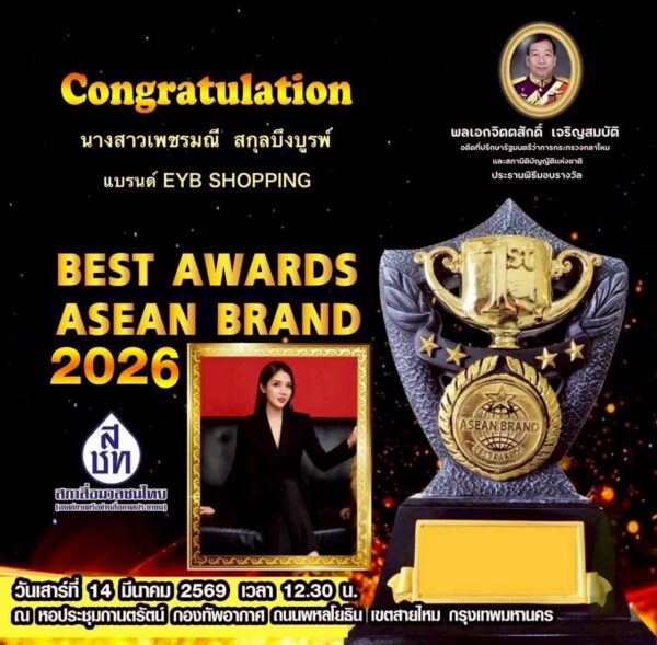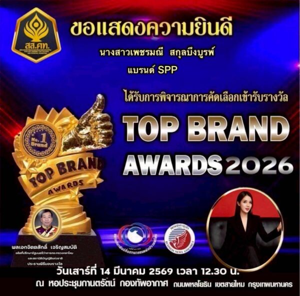 โดย คุณเพชรมณี สกุลบึงบูรพ์ เจ้าของแบรนด์ SPP และ แบรนด์ EYB SHOPPING ถูกรับคัดเลือกให้เข้ารับสองรางวัลใหญ่ TOP BRAND AWARDS 2026 และ รางวัล BEST AWARDS ASEAN BRAND 2026